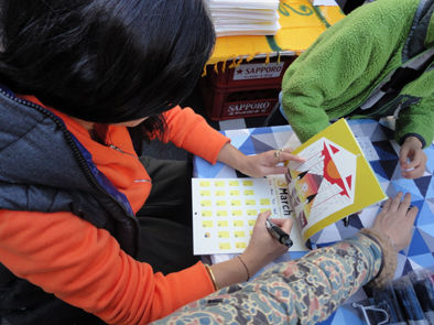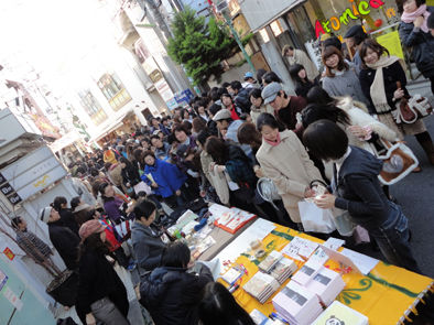 昨日12月5日、「もしもし下北沢フリマ」の第2回が開催されました。寒かったけれども透き通るような青空で、お天気に恵まれて本当によかった。今回は、商店街の入り口と終わりに飾る横断幕から関わって、前日ははっちゃんとペンキを塗りまくる一日!でも大きなキャンバスにペンキを塗りたくるのは、それはそれは楽しいものなのです。完成しないのではないかと危ぶまれた横断幕もチームワークにて乗り切り、無事に2枚、完成しました。上が南口商店街側の旗で、朝太陽が昇る街。下が茶沢通り沿いの旗で、夕方太陽が沈む時のの街になっています。