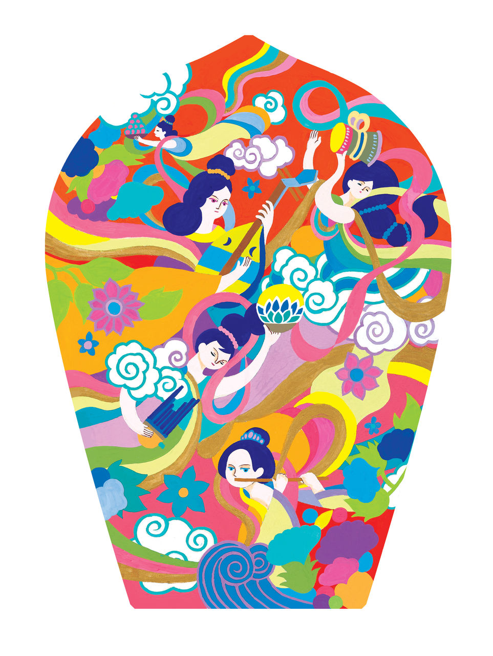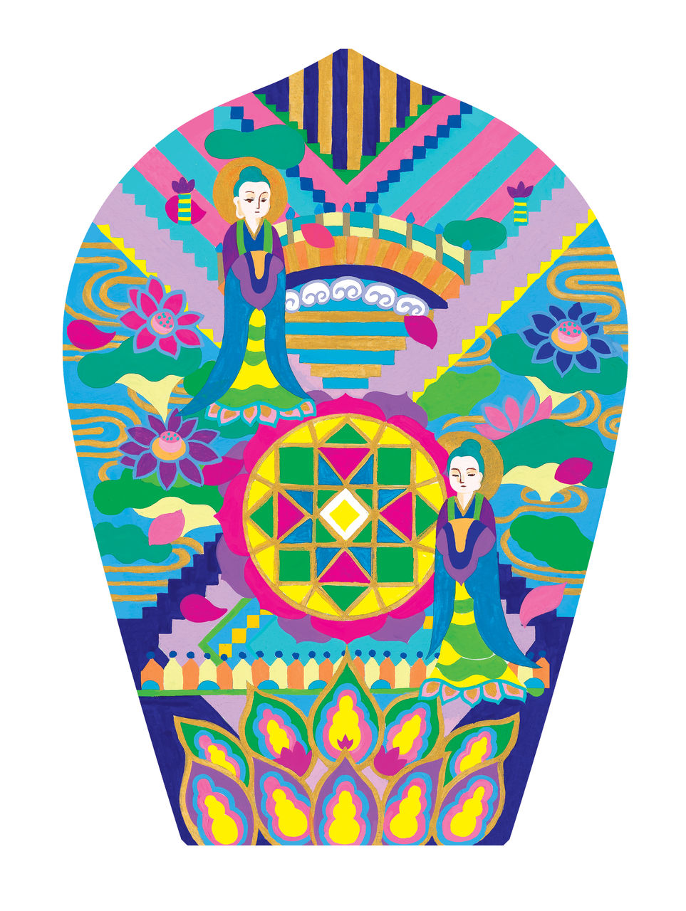 極楽、つまり天国、漠然としたイメージはあっても実際には知らないことだらけ。でもいざ描き始めたらとても面白く、頭がからっぽになっているのに指が動いているような感覚があり、ちょっと幽体離脱に近かったような気がします。(幽体離脱ちゃんとしたことないけど...)