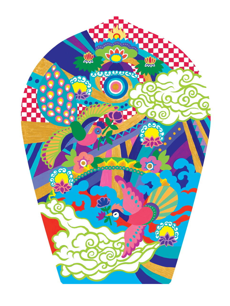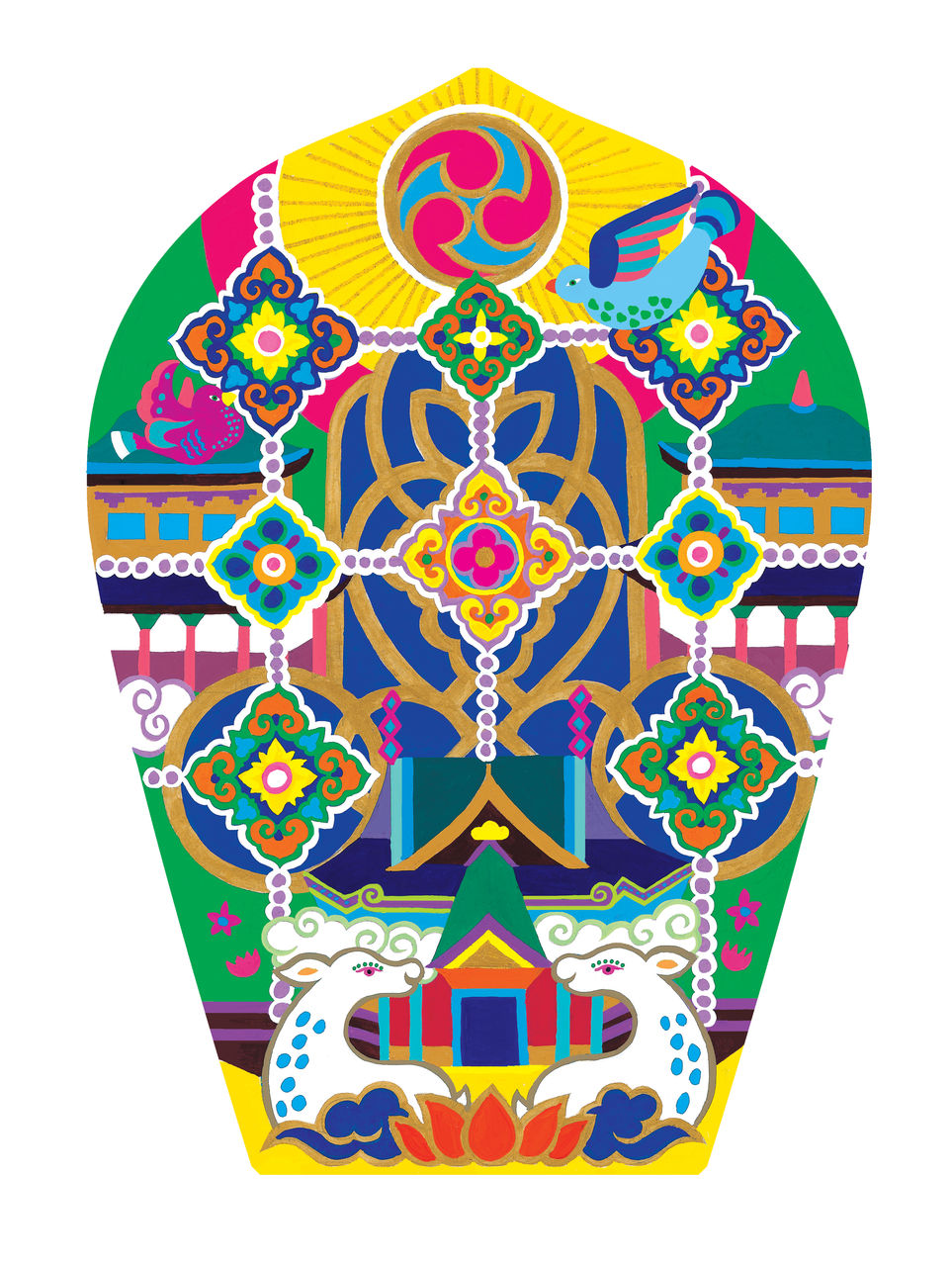 ご依頼を頂けた事はとても嬉しく光栄だったのですが大役に緊張してしまい、極楽に関する知識もなかったので、時間もかかりました。極楽ってどんなところ?極楽にいる動物は何か?どんな音楽が流れているのか?あったかいのかな?空気はどんな匂いなのかな?といろいろ想像をめぐらせました。